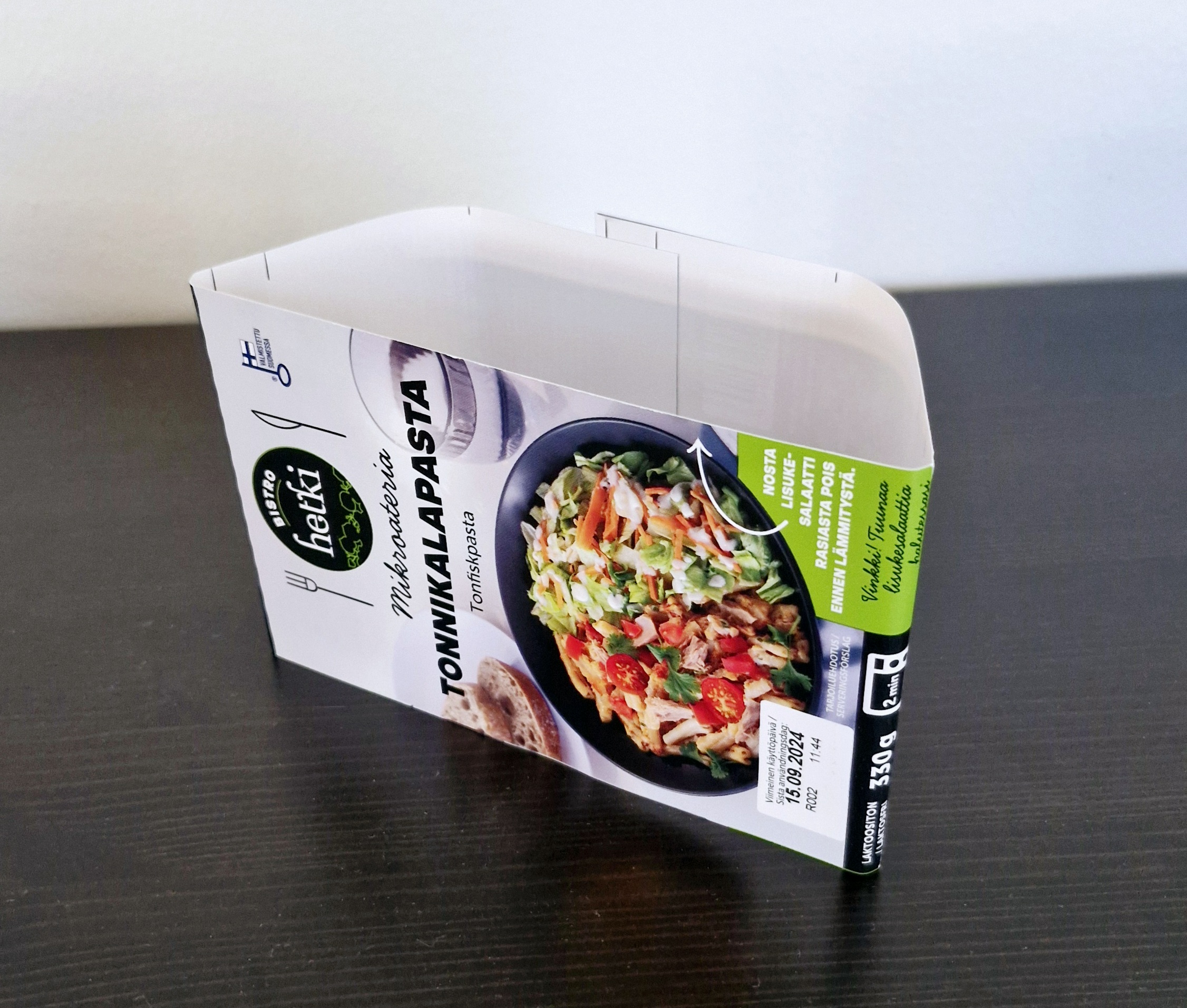 Linerless vyöte-etiketillä voidaan korvata myös valmisruokapakkauksissa käytetty kartonkikotelo. Tällöin etiketti nuutataan tai perferoidaan niin, että etiketin taitokset ovat teravät ja siistit. Etikettiin voidaan stanssata myös ikkunoita. Ravenwood slideable -etiketti liikkuu pakkauksen päällä, jolloin tuotetta pääsee helpommin tarkastelemaan.